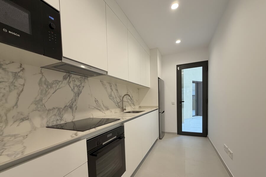 This exclusive 3-bedroom apartment with terrace is located in a central area of Palma, right next to the vibrant Ramblas. It impresses with high-quality materials, modern design, and thoughtful finishes. The apartment features three spacious bedrooms and two elegant bathrooms, one of them en suite. Underfloor heating and air conditioning (hot/cold) ensure maximum comfort throughout the year. The separate, modern kitchen offers ample space for culinary creativity, while the sunny terrace is perfect for relaxing. Located on the first floor of a newly constructed building with elevator, the apartment also includes a parking space and storage room. Thanks to its central location, you can enjoy all the benefits of urban living in Palma: restaurants, cafés, shops, and cultural attractions are right at your doorstep. The apartment can be rented furnished (3500 Euros/month) or unfurnished.